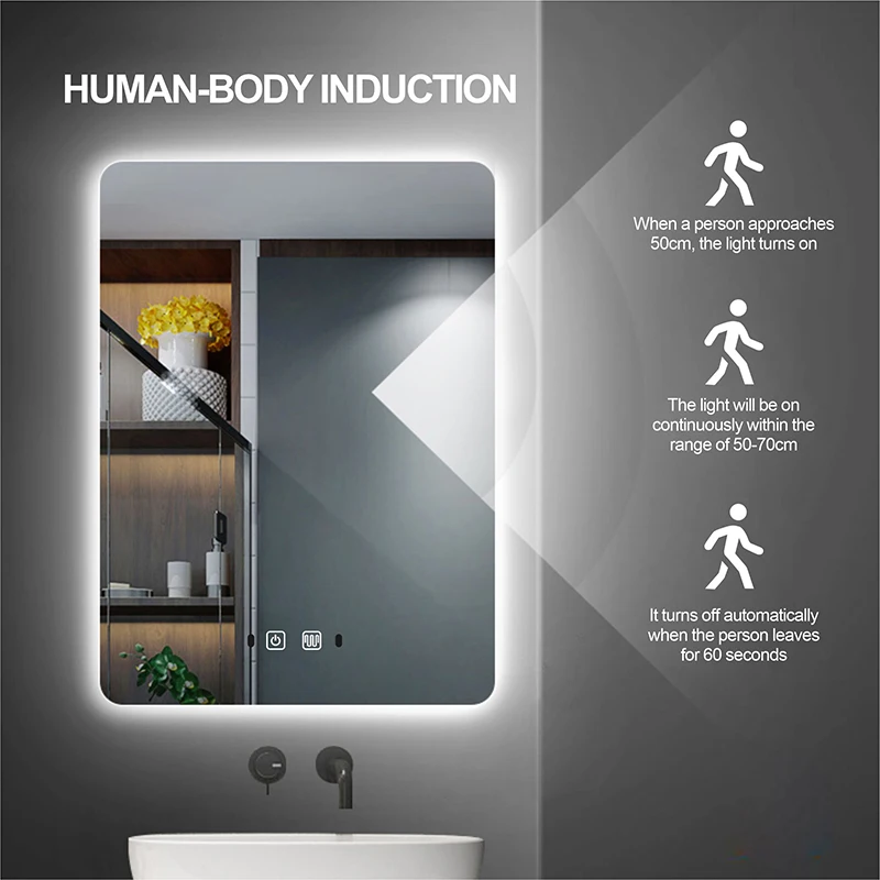 - Inducción del cuerpo humano: Enciende y apaga el espejo automáticamente con un simple movimiento de la mano.