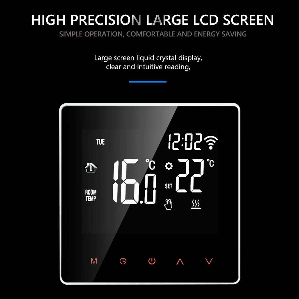 - Elegancia y diseño: La pantalla táctil LCD con retroiluminación y el diseño minimalista del termostato se integran a la perfección en cualquier decoración.